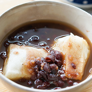 ③焼いたお餅を入れ、ぜんざいのできあがりです。